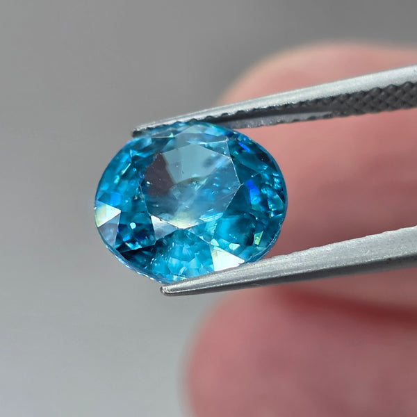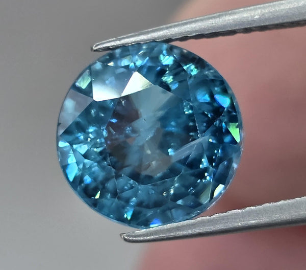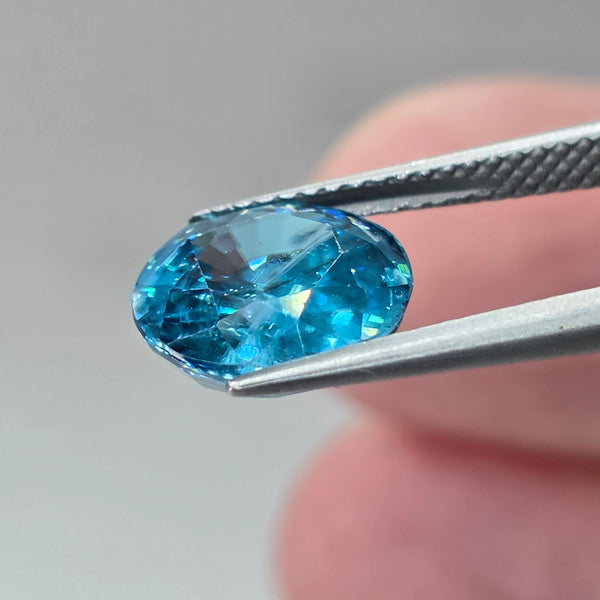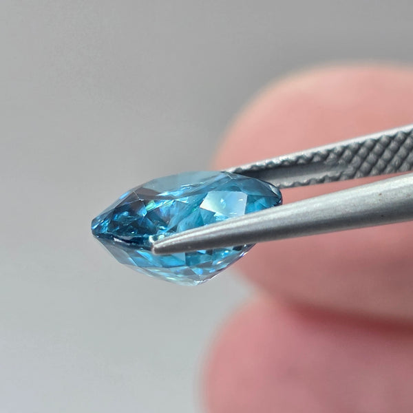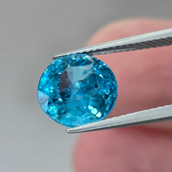 Natural earth-mined Blue Zircon from Cambodia. Top color.Weight: 5.55 CaratShape: RoundSize: 10 x 5.6 mm.Treatment: Gentle HeatClarity: SI1