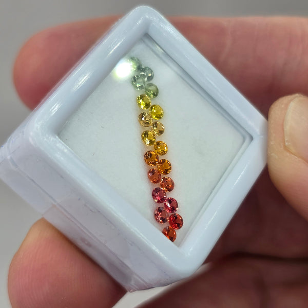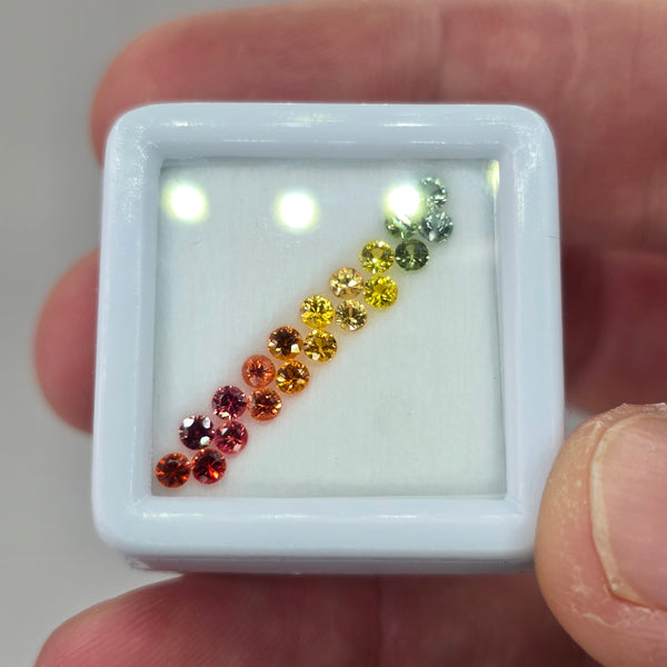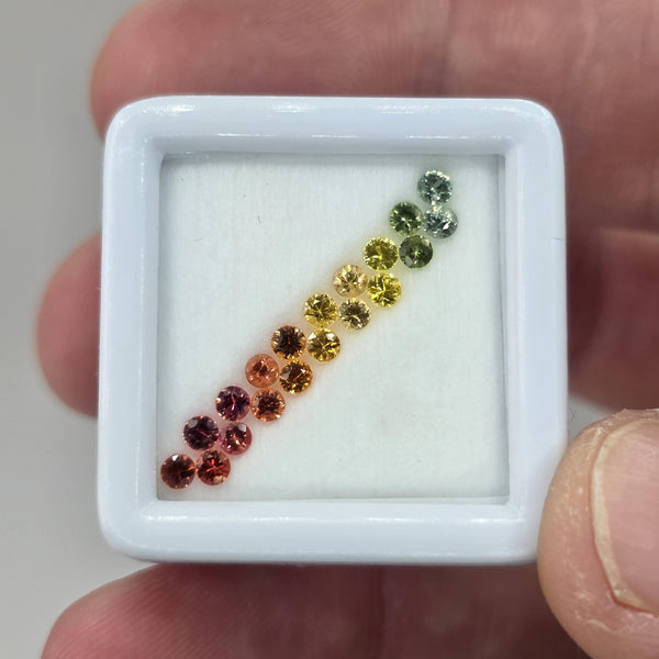 Natural earth-mined Sapphire from Songea, Tanzania. 19 pieces.Weight: 1.23 carat total weightQuantity: 19 Pc(s)Shape: Round Brilliant-CutSize : 2.3 mm.Treatment: BEClarity: VS-VVS
