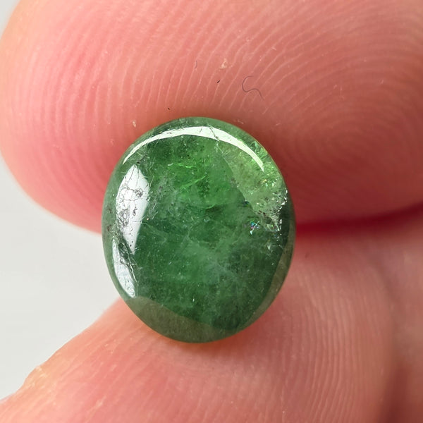 Natural earth mined Tsavorite Garnet from Tanzania. Weight: 5.50 carat Shape: Oval Cabochon Size: 10.0 x 8.8 x 6.2 mm. Treatment: Unheated Untreated Clarity: Opaque