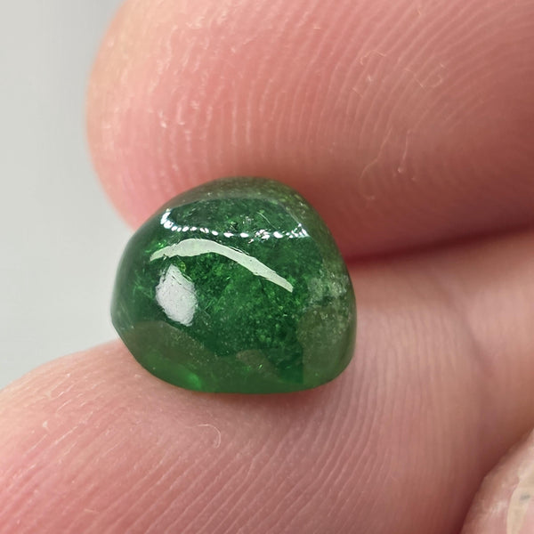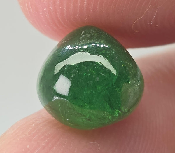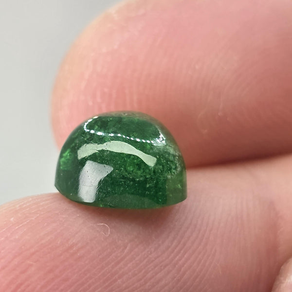 Natural earth mined Tsavorite Garnet from Tanzania. Weight: 5.60 carat Shape: FreeForm Cabochon Size: 10 x 9 x 6 mm. Treatment: Unheated Untreated Clarity: Semi-Transparent