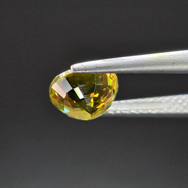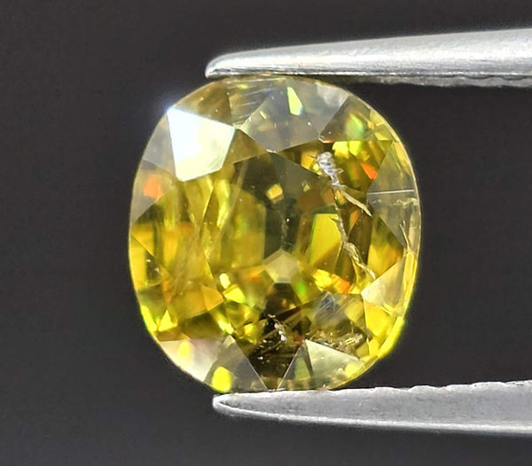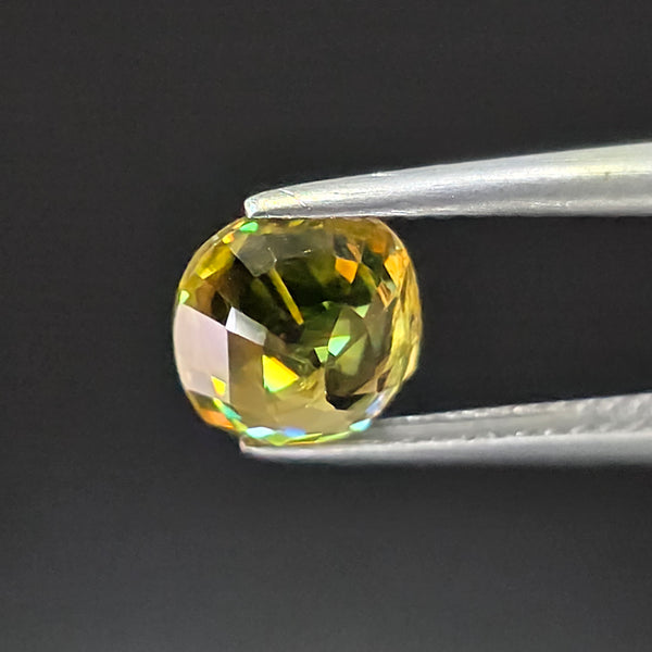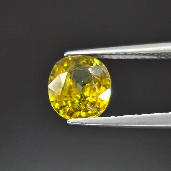 Natural earth-mined Sphene from Madagascar, Africa.Weight: 1.85 CaratShape: CushionSize: 7.7 x 6.9 x 4.2 mm.Treatment: Unheated UntreatedClarity: SI1
