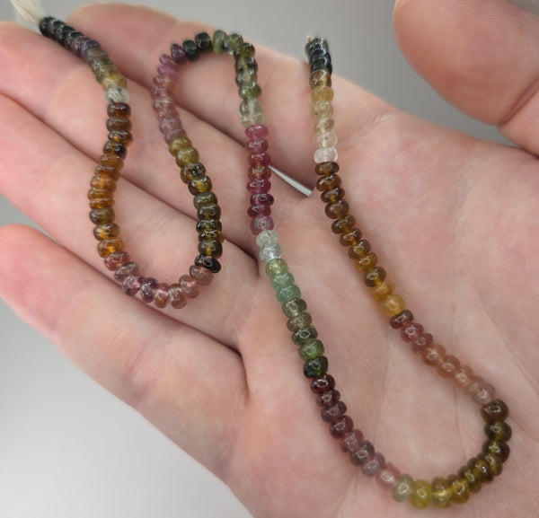 Natural earth-mined polished multi-color Tourmaline beads from Africa. 14 inch strand.